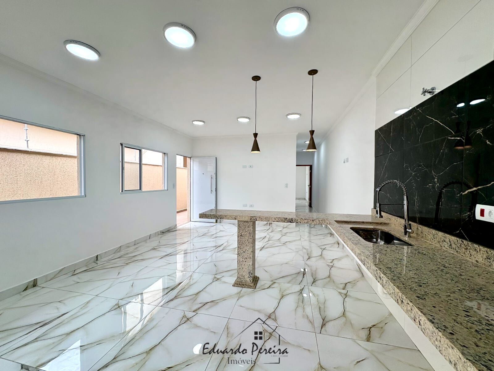 O imóvel conta com 2 dormitórios, sendo 1 suíte, sala bem iluminada e cozinha americana com balcão em granito, integrada à pia da área de lazer e churrasqueira.