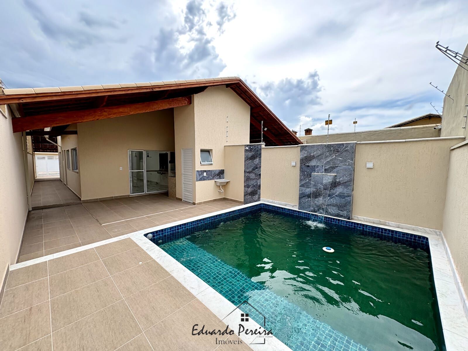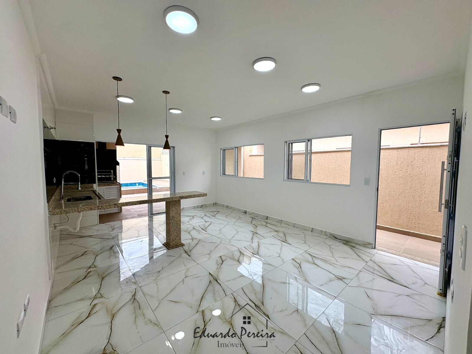 A churrasqueira gourmet possui laterais em vidro, proporcionando um ambiente elegante e funcional. A área externa dispõe de piscina 4x4m com iluminação em LED e cascata, perfeita para momentos de lazer.